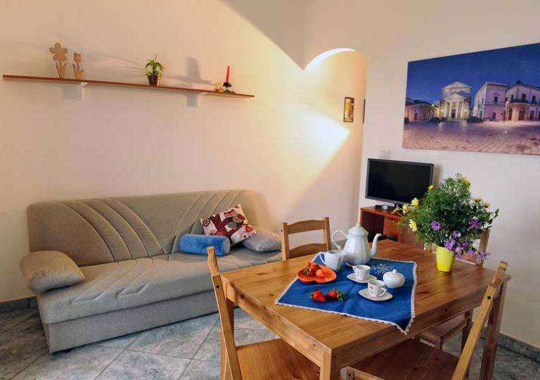 L’interno si compone di un soggiorno con angolo cottura, una camera matrimoniale con affaccio su balcone, una cameretta con letto a castello e un bagno con box doccia. La casa può ospitare comodamente fino a 4 persone. La superficie interna è di circa 45 mq. Completa la proprietà un posto auto riservato all’interno di un’area chiusa da cancello.