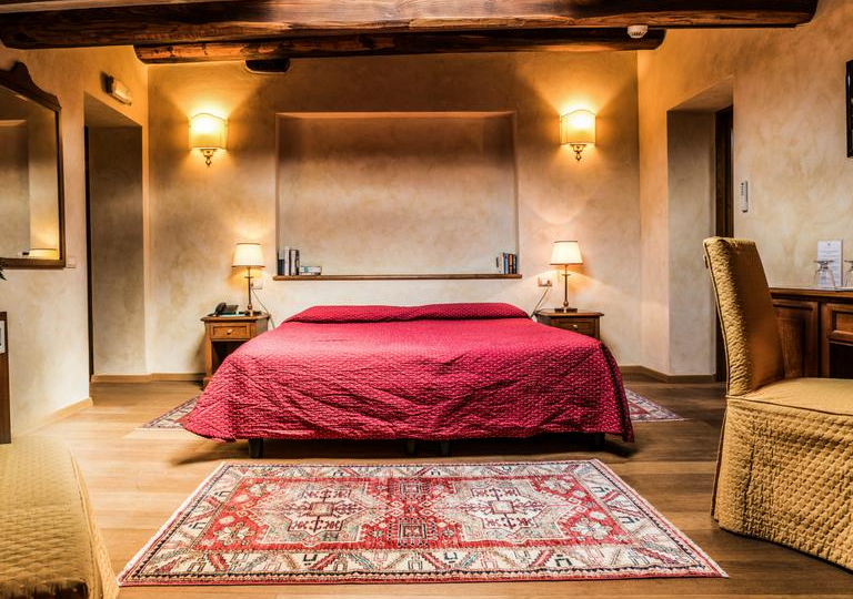 Le camere, divise su tre piani, sono costituite da arredamenti moderni a cui si alternano pavimenti in cotto e soffitti affrescati. Dotate di ogni confort: aria condizionata e riscaldamento, televisore satellitare a schermo piatto, cassaforte e minibar, linea cortesia per gli ospiti, telefono con linea diretta e connessione ad internet.